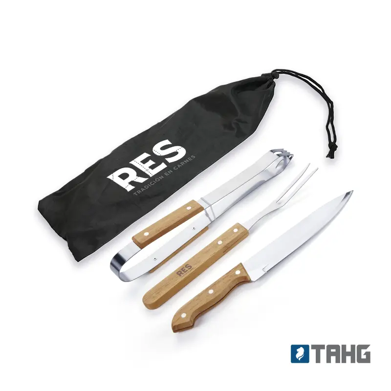 Set de asado con cuchillo, tenedor y pinza. Fabricado en madera de hevea y acero inoxidable 420. Contiene cuchillo, tenedor trinchador , pinza para asado y bolsa de guardado de nylon. Es ideal para manipular cortes de carne con precisión y comodidad durante la parrilla o asados al aire libre.