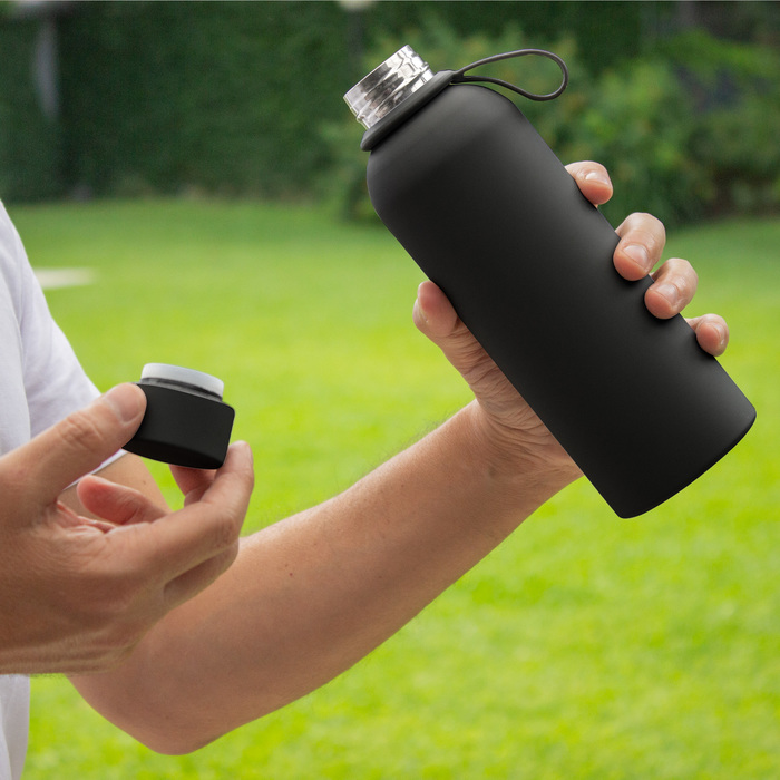 Botella doble pared, sellada al vacío. Interior de acero 304 y exterior de acero 201. Tapa a rosca de acero 201, interior plástico con anillo de silicona. Asa de silicona para un transporte fácil. Pintura con terminación suave al tacto. Mantiene hasta 6 hs la temperatura de las bebidas calientes y 12 hs de las bebidas frías.