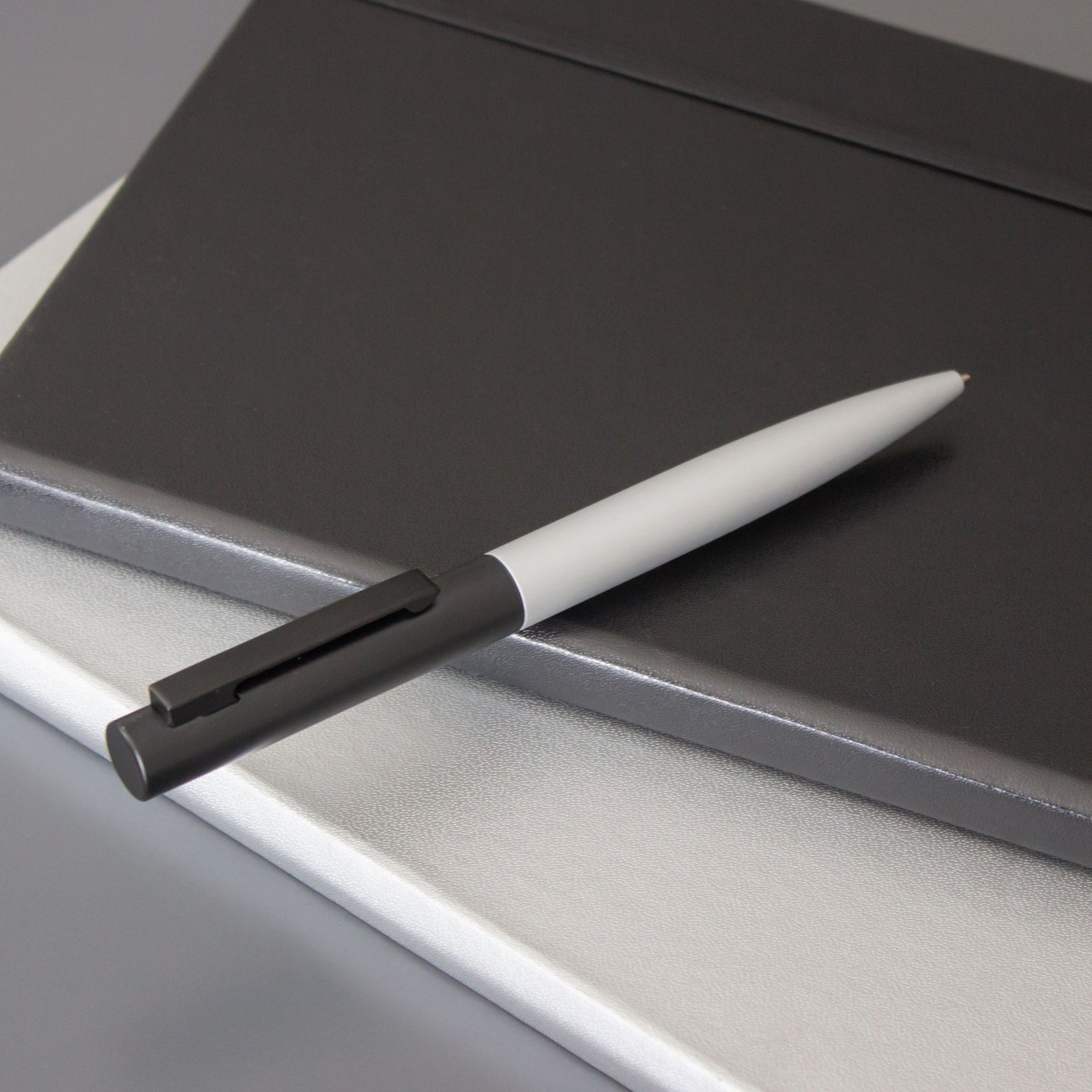 Metal. Cuerpo metálico plata mate. En la parte superior color negro con clip del mismo color. Apertura giratoria. Tinta negra.