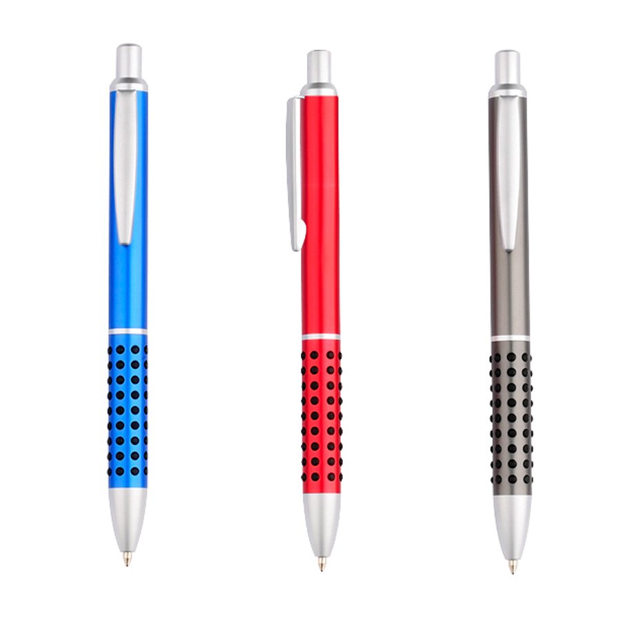 Bolígrafo metálico satinado modelo "Caterpillar", con lunares de goma negra que brindan una suave sensación de masaje dactilar al escribir. Escritura azul.