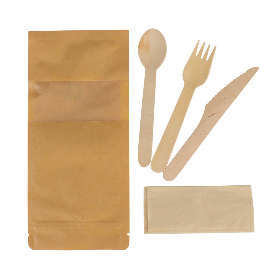 Set de 3 cubiertos de madera de Abeto + servilleta doble de papel de Bamboo, presentados en bolsa rígida de papel impermeabilizado con cierre hermético tipo ZIP. Cuenta con ventana translúcida por el anverso y con información de productos por el reverso. Cubiertos: Cuchillo, Tenedor, Cuchara.