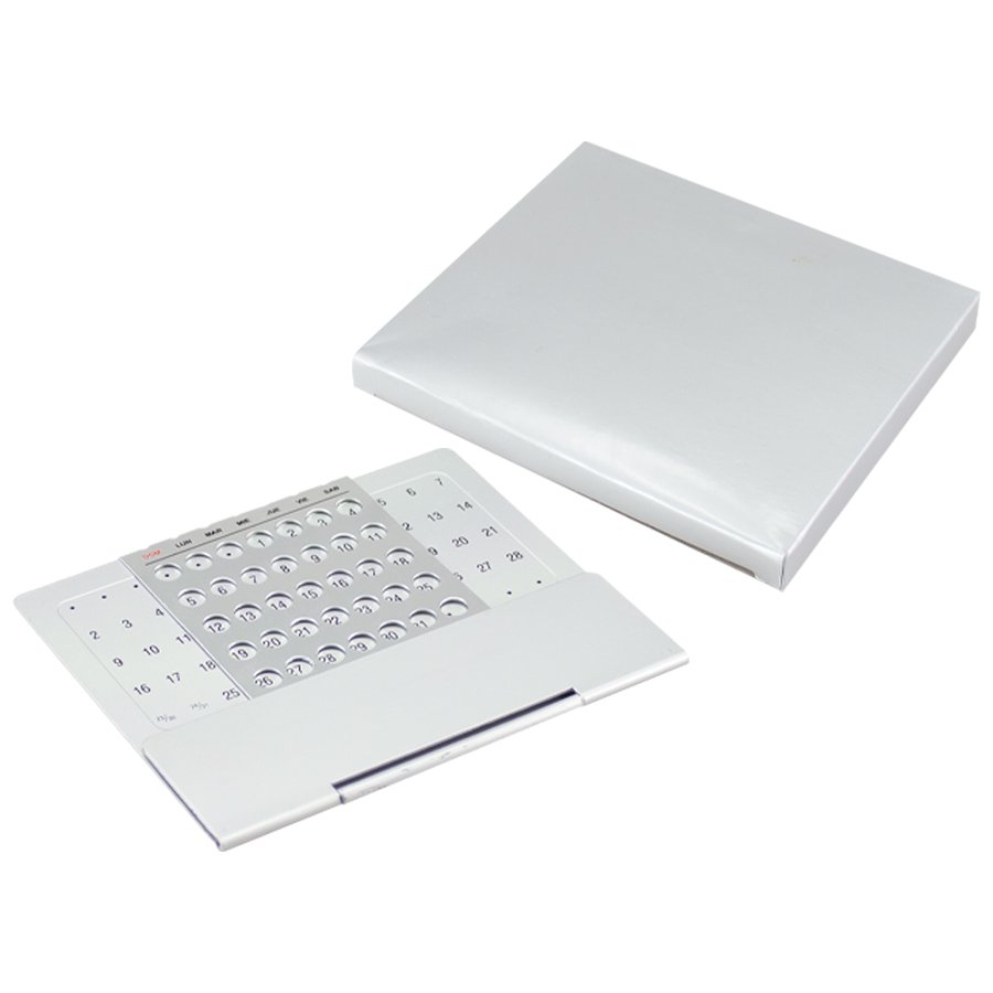 Calendario Eterno Metálico de escritorio, para todos los días, meses y años. Con ventana semanal móvil en español. Presentación en cajita plateada de regalo.