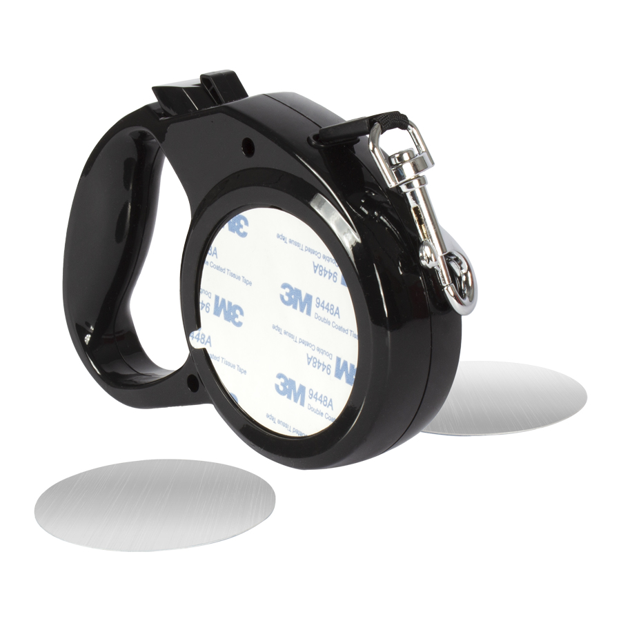 Correa extensible de 3mts para mascota, en plástico ABS negro, mosquetón de Acero inoxidable y correa de nylon color negro con sistema de traba. Contiene 2 compartimentos circulares y 2 placas metálicas blancas, para sublimar y pegar en ambos lados del producto.